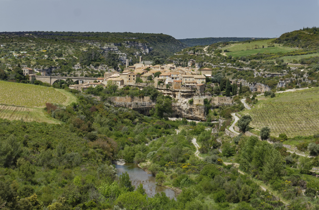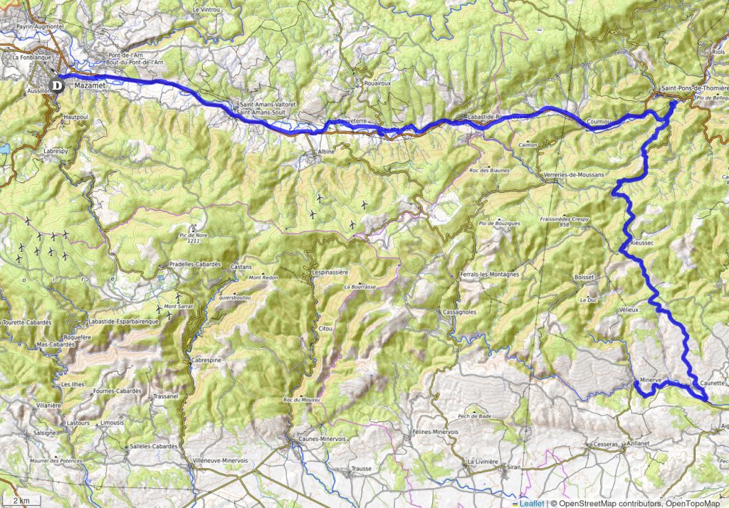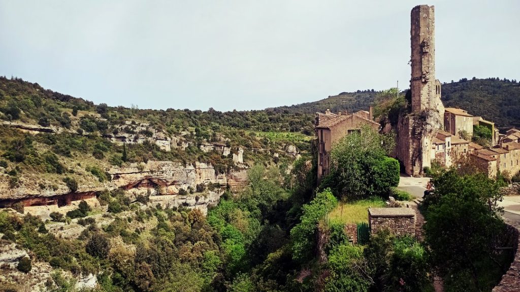 Pour débuter ce troisième jour, nous suivons une voie verte en parallèle de la route de Saint Pons de Thomières. Voie d’un intérêt très relatif, ensuite nous monton au Col de Sainte Colombe et descente sur Caunette et ensuite Minerve, superbe village médiéval, très touristique et réputé pour son vignoble, le minervois.