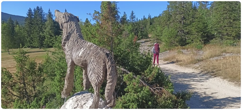 Nous progressons vers le 45 ème parallèle et croisons une statue de loup taillé dans un tronc d’arbre.