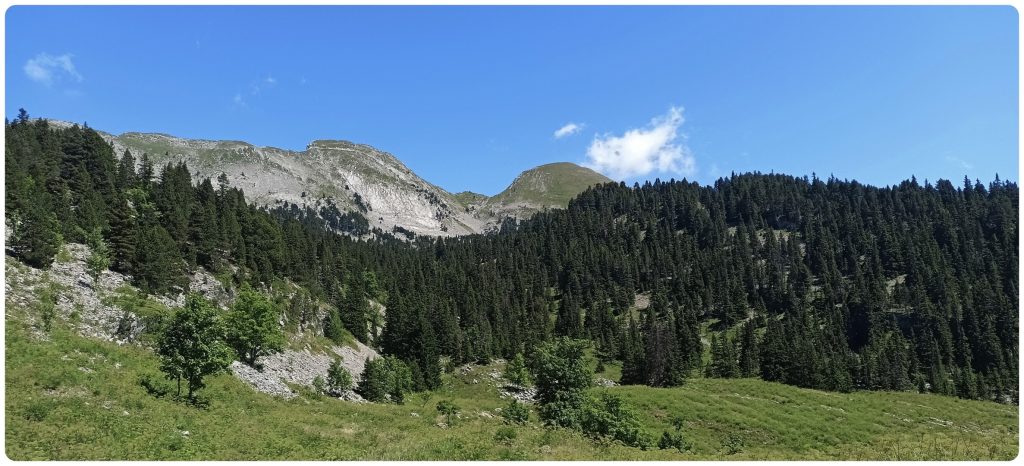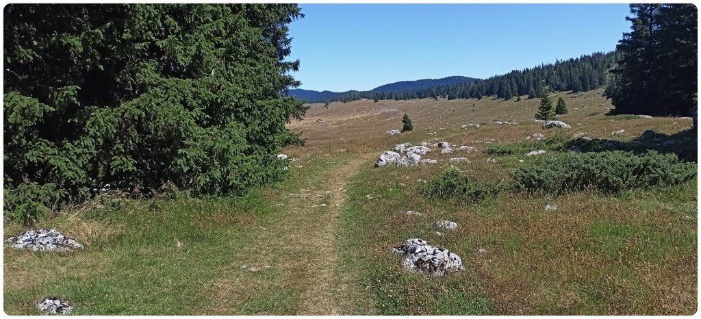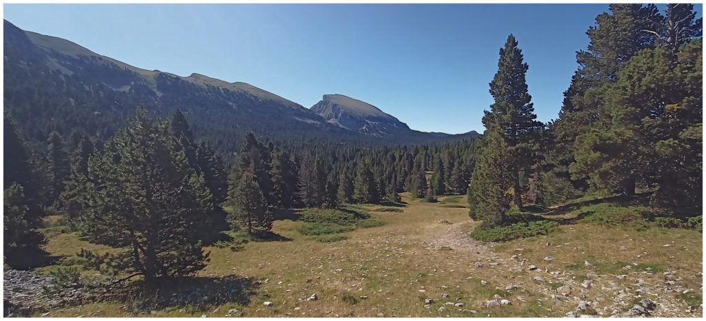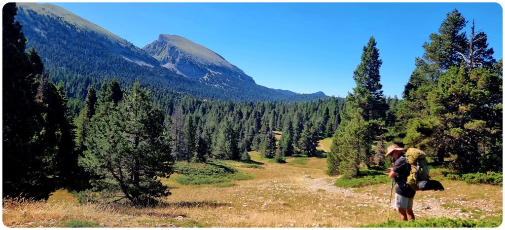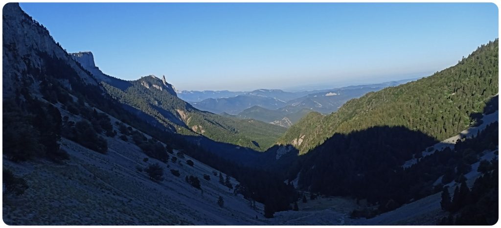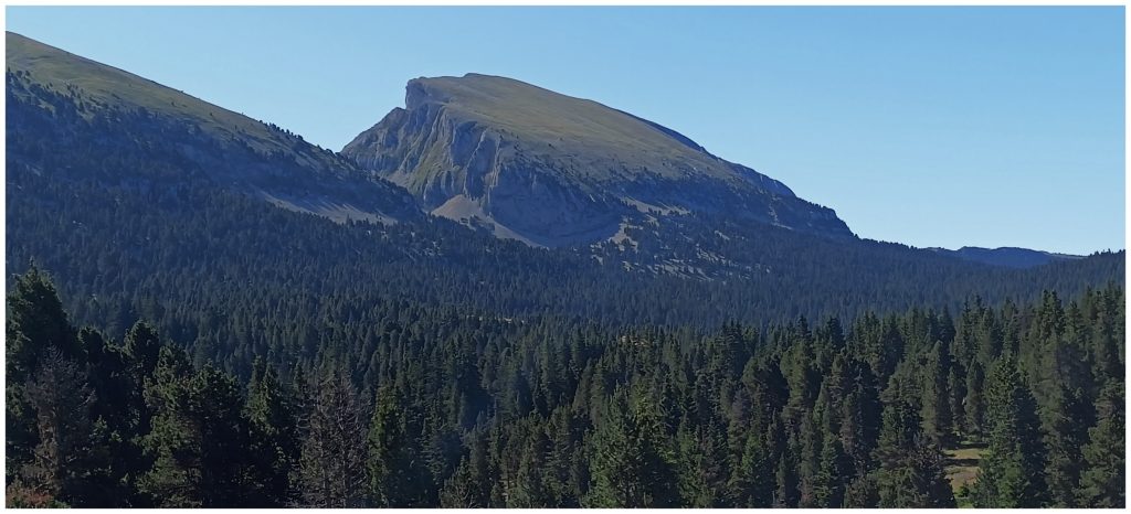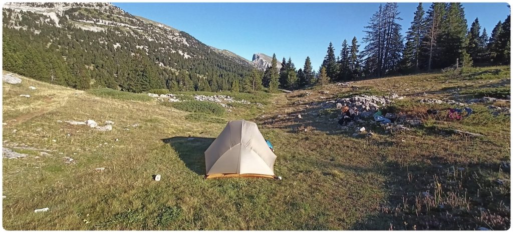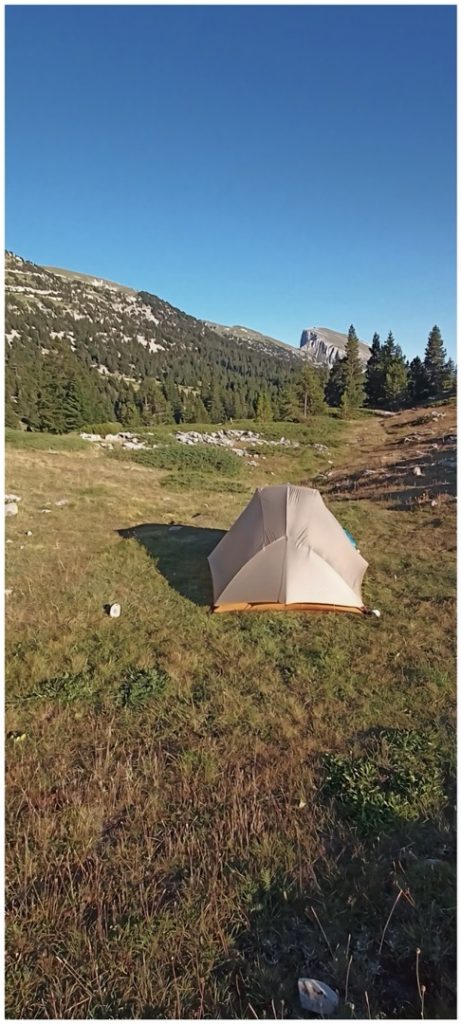 Nous continuons le chemin pour trouver une zone de bivouac « confortable », avec le Grand Veymont à l’horizon.