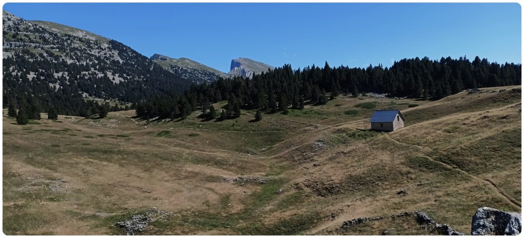 Nous dépassons la Grande Cabane, bergerie dont il faut faire le tour pendant les périodes d’alpage. Nous laissons le Grand Veymont derrière nous.