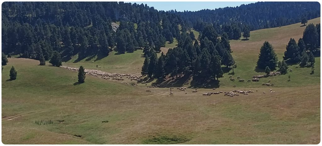 Nous continuons jusqu’à Pré Peyret où nous bivouaquerons après avoir laissé passer un troupeua de brebis et les patous ou autres bergers d’Anatolie qui les accompagnent.