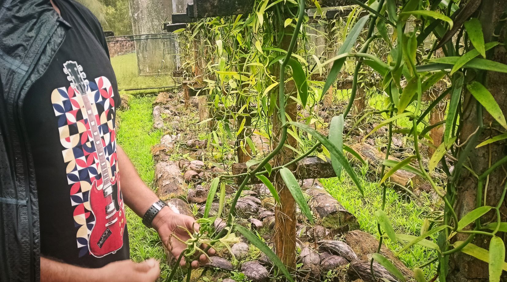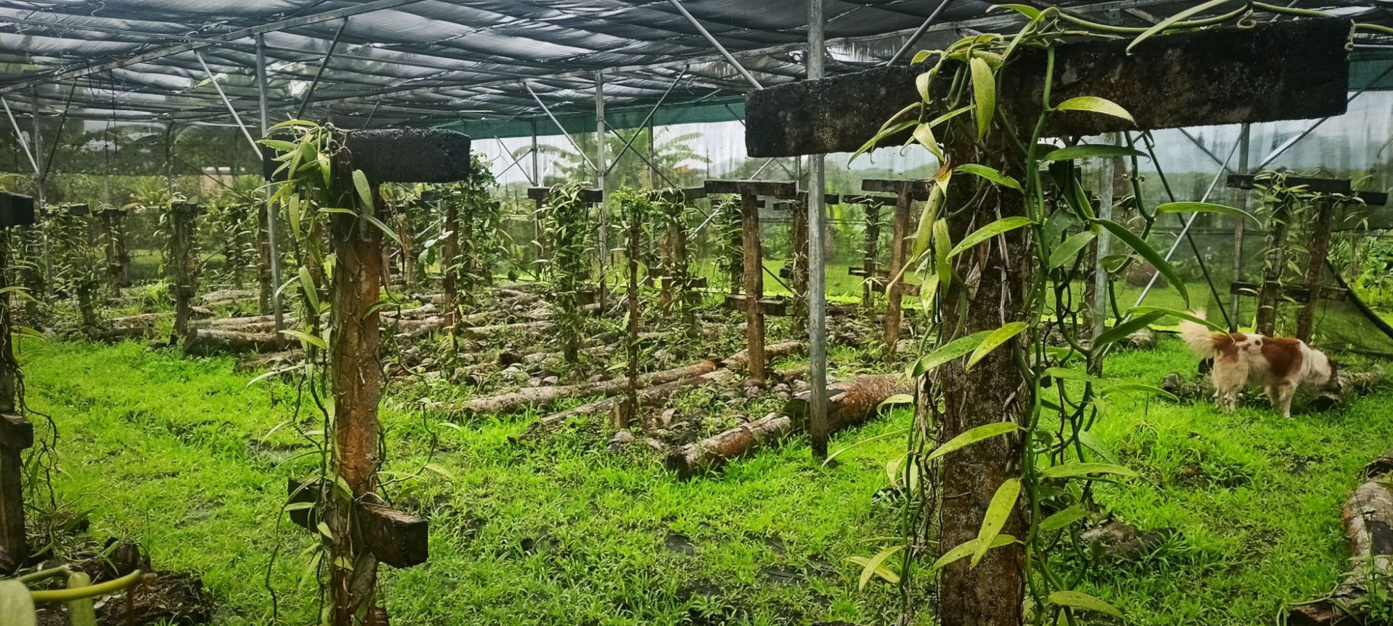 Après une nuit confortable dans la « fare » et un petit déjeuner, la pluie nous décide d’aller visiter la pépinière de vanille de notre logeur. Visite intéressante qui démontre la difficulté de cultiver cette plante.